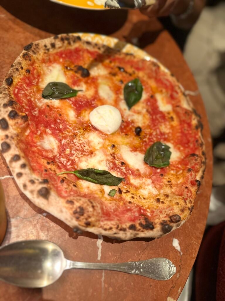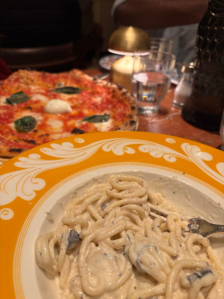 Now to the main part: the food. We started with the Spaghettone al Tartufo, which is spaghetti with a creamy truffle sauce, Parmigiano Reggiano foam, and fresh black truffle. I genuinely do not have enough words to explain how good it was. The truffle flavour really stood out and enriched the dish, and it is something I would order every time I visit. We also ordered the Margherita di Bufala, and it is safe to say this was not your typical Margherita pizza. The flavours were excellent.
